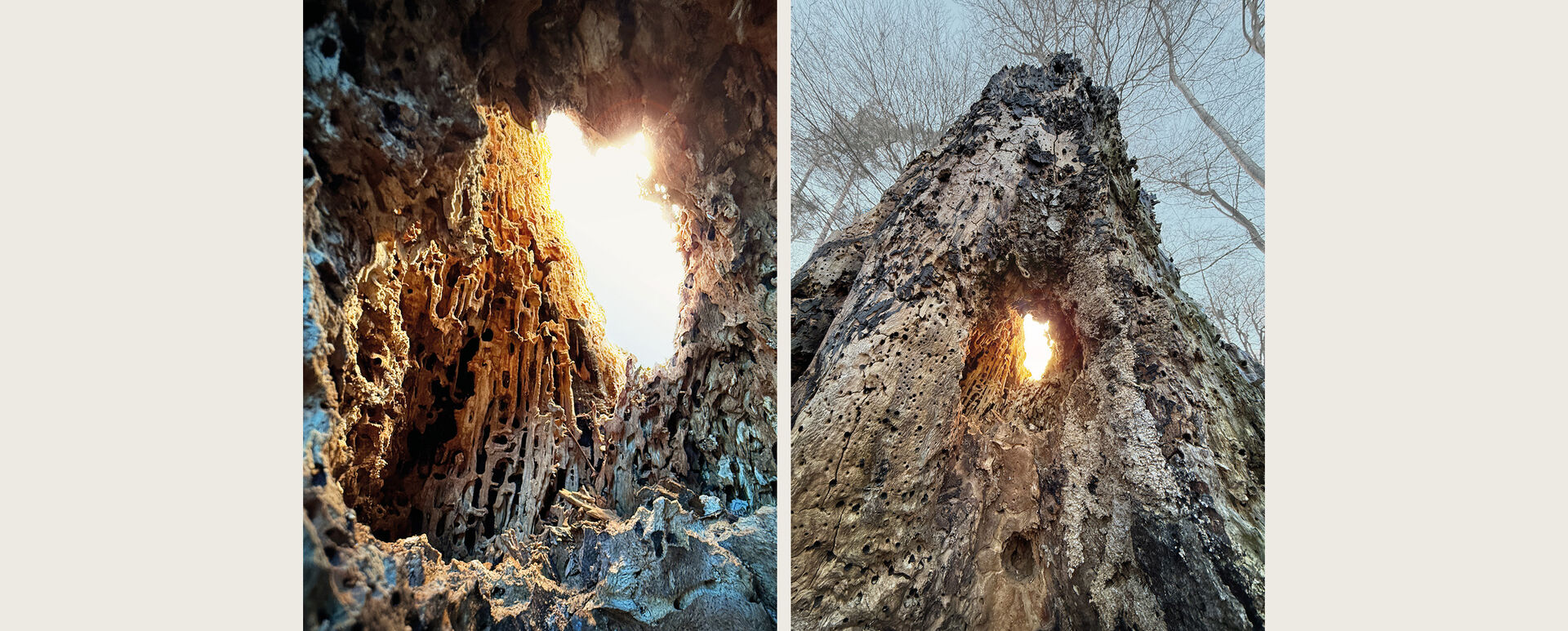 Totholz ist kein Ort des Endes, sondern eine Quelle neuen Lebens. Käfer bohren Gänge, Larven verpuppen sich, Pilze und Mikroorganismen zersetzen das Holz und wandeln es in Nährstoffe um. Organische Materie wird in Wasser und Kohlendioxid umgesetzt. Dieser ewige Kreislauf der Transformation zeigt sich in den Fraßspuren, die an Ornamente antiker Kathedralen erinnern. Atrium Sacrum offenbart, wie das scheinbar Tote zur Brutstätte des Neuen wird – ein Symbol für die zyklische Natur des Lebens: Während wir leben, verfallen wir. Und im Verfall wird Neues geboren.